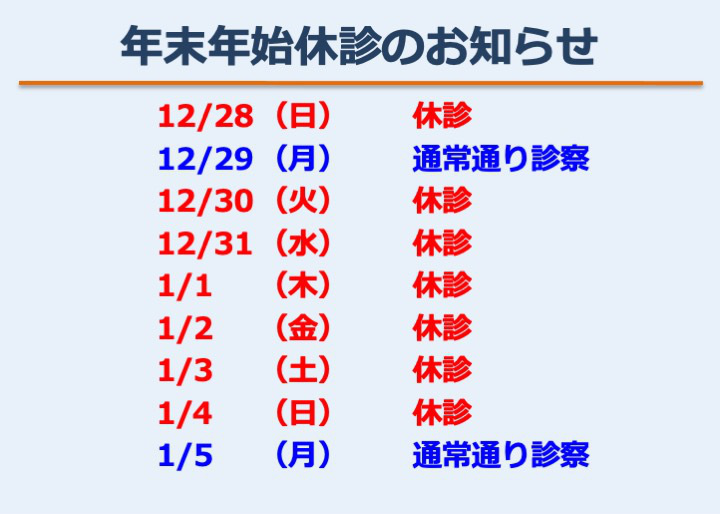 令和7年12月30日火曜日から令和8年1月4日日曜日まで休診とさせていただきます。ご迷惑をおかけしますがご理解の程よろしくお願いいたします。