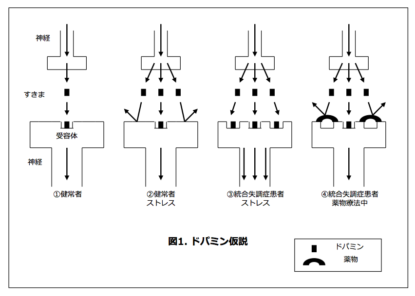 上の図1の①健常者というところを見てください。上の神経を1本の矢印(電気信号)が下に向かって進み,隙間を一つの黒い■(神経伝達物質)が下に進み,下の神経にたどり着いてその中を一本の矢印(電気信号)がまた下に向いて進んでいます。これが健康な状態です。ここで、黒い■(神経伝達物質)が下の神経につく場所(黒い■を船とすると,港にあたる場所)を受容体と言います。健常者がストレスを感じているときに(図1の②)は,1つの矢印に対して上の神経からのドパミン(黒い■,船)の放出が3つに増えますが,受容体(黒い■がつくところ,船の港)が一つしかないために,下の神経の矢印は1本のままです。ところが,統合失調症になりやすい体質を持っている方は,受容体(黒い■がつくところ,船の港)が最初から3つあるために,ストレスがかかって1つの矢印に対して上の神経からのドパミン(黒い■,船)の放出が3つに増えた場合,受容体も3つあるため,下の神経の下向きの矢印が3本になってしまいます(図1の③)。これが統合失調症のドパミン仮説です。この仮説に基づいて,ドパミンの受容体を薬でブロックするような物質を統合失調症の薬剤として治療で利用しています(図1の④)。薬物を服用していれば受容体を健康な状態に近づけてくれますが,薬物の服用を中止すると,効果がなくなってしまいます。